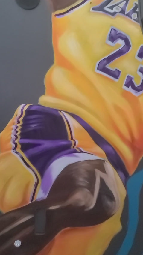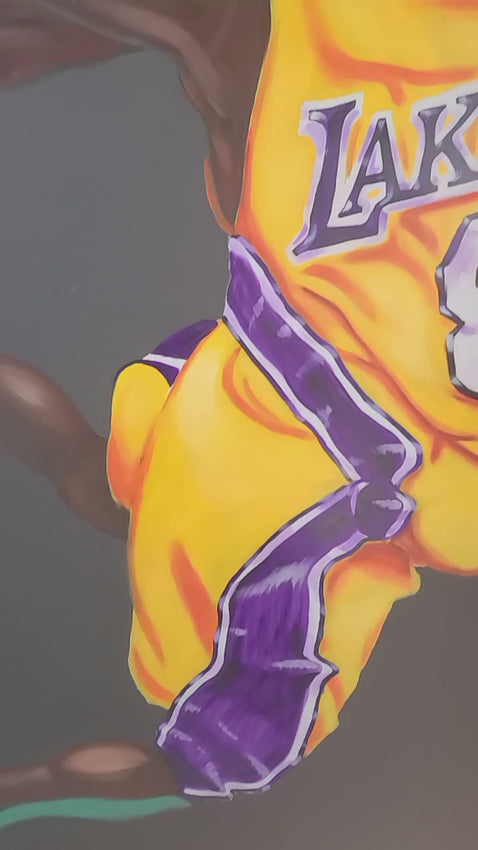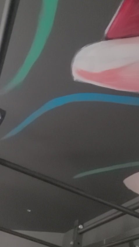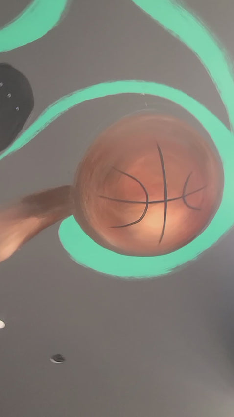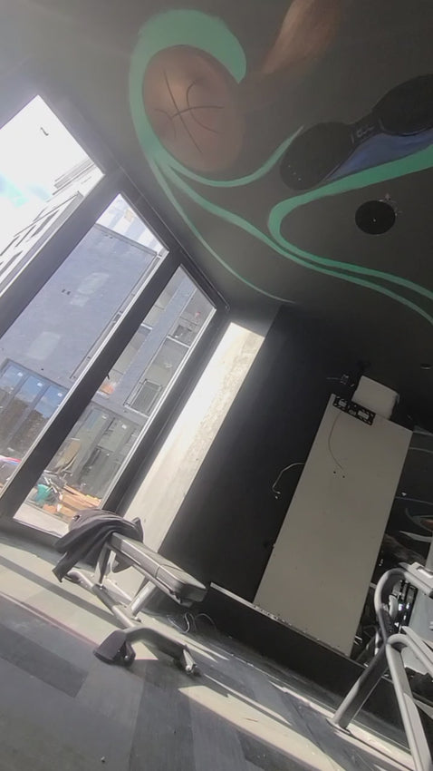 In this luxury gym, Zack redefines the space by taking the art skyward, transforming the ceiling into a monumental canvas of inspiration. Towering at ten feet in scale, larger-than-life portraits of icons such as Kobe Bryant and Michael Jordan dominate the overhead expanse, radiating energy and presence from above.